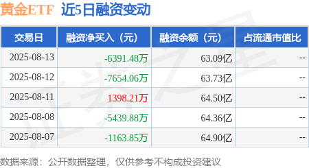 本站消息,8月13日,黄金ETF(159934)融资买入1977.13万元,融资偿还8368.62万元,融资净卖出6391.48万元,融资余额63.09亿元。